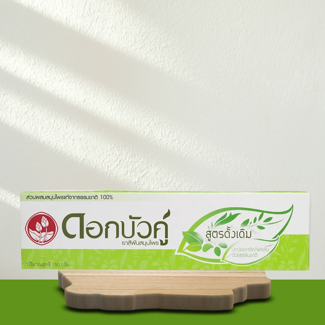 ตำรับสมุนไพรแท้ที่เป็นเอกลักษณ์พิเศษเฉพาะของดอกบัวคู่ดูแลทำความสะอาดช่องปากและฟันด้วยเนื้อสมุนไพรแท้เข้มข้นสีน้ำตาล